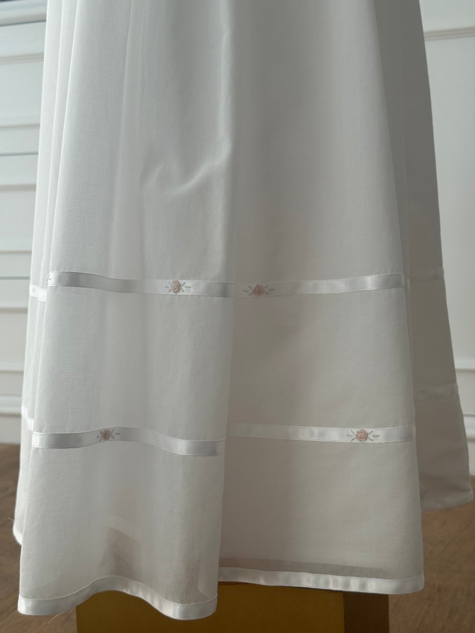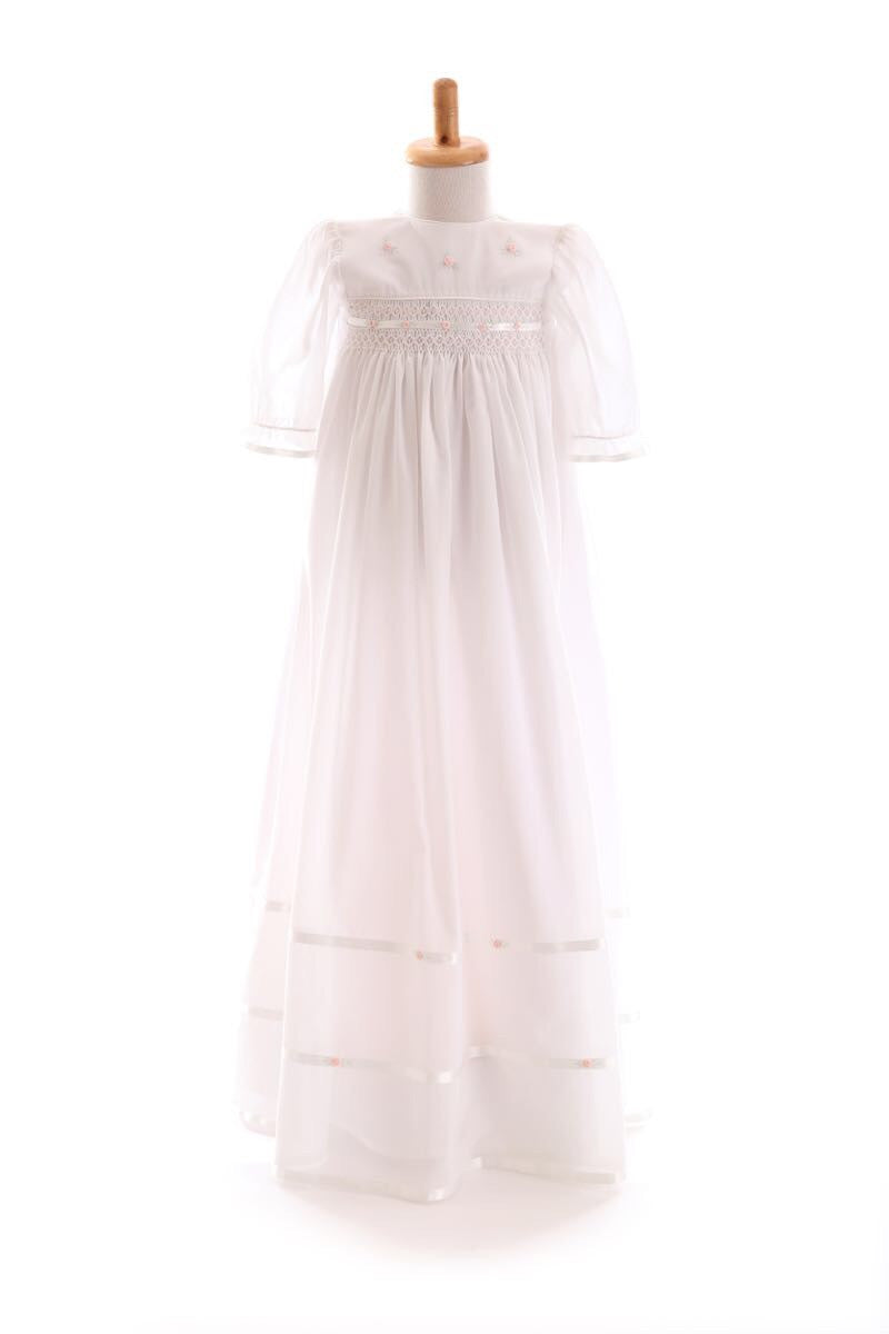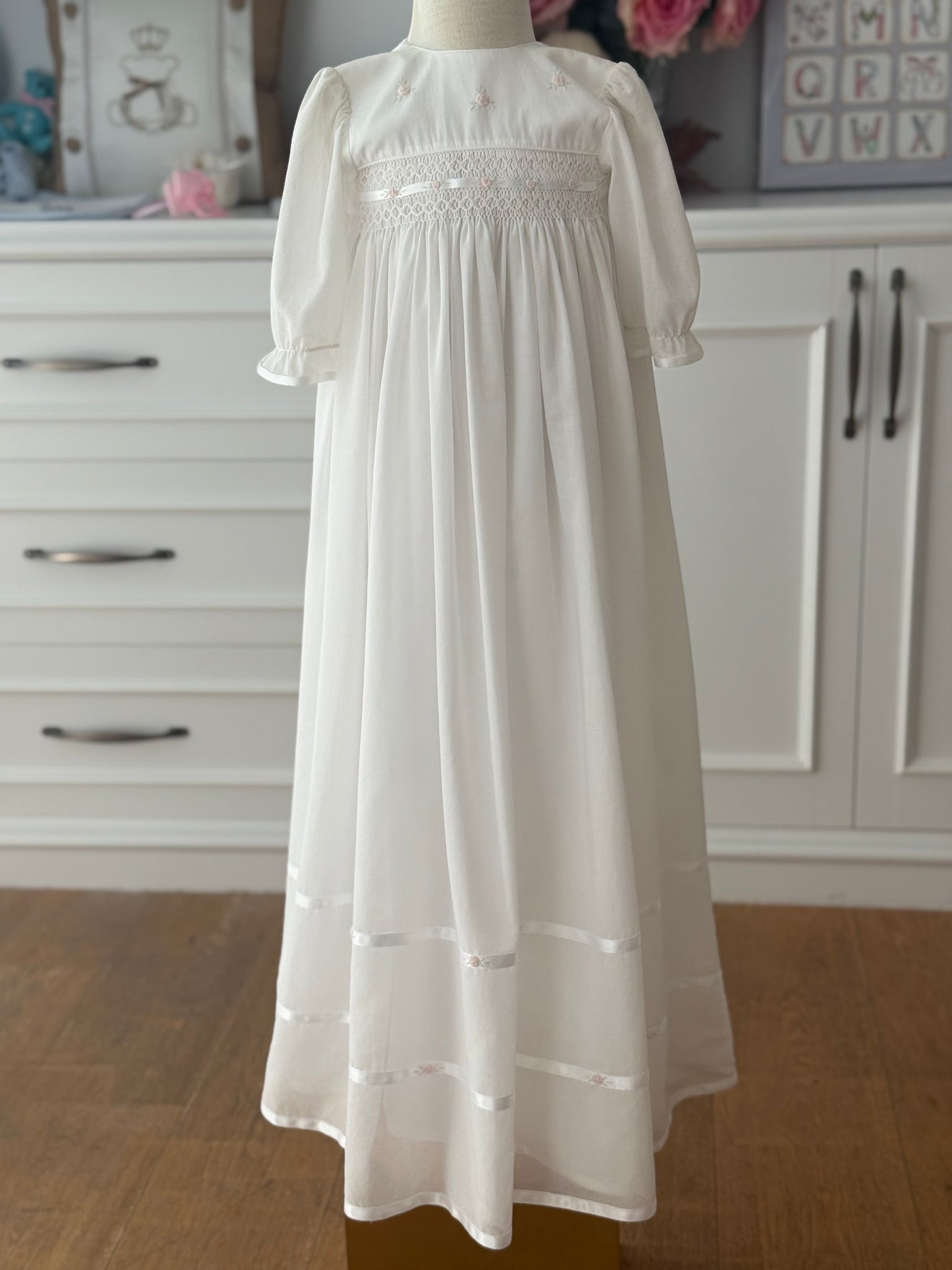 Hand smocked bodice with a silk ribbon across and and embroidered roses in soft pink.